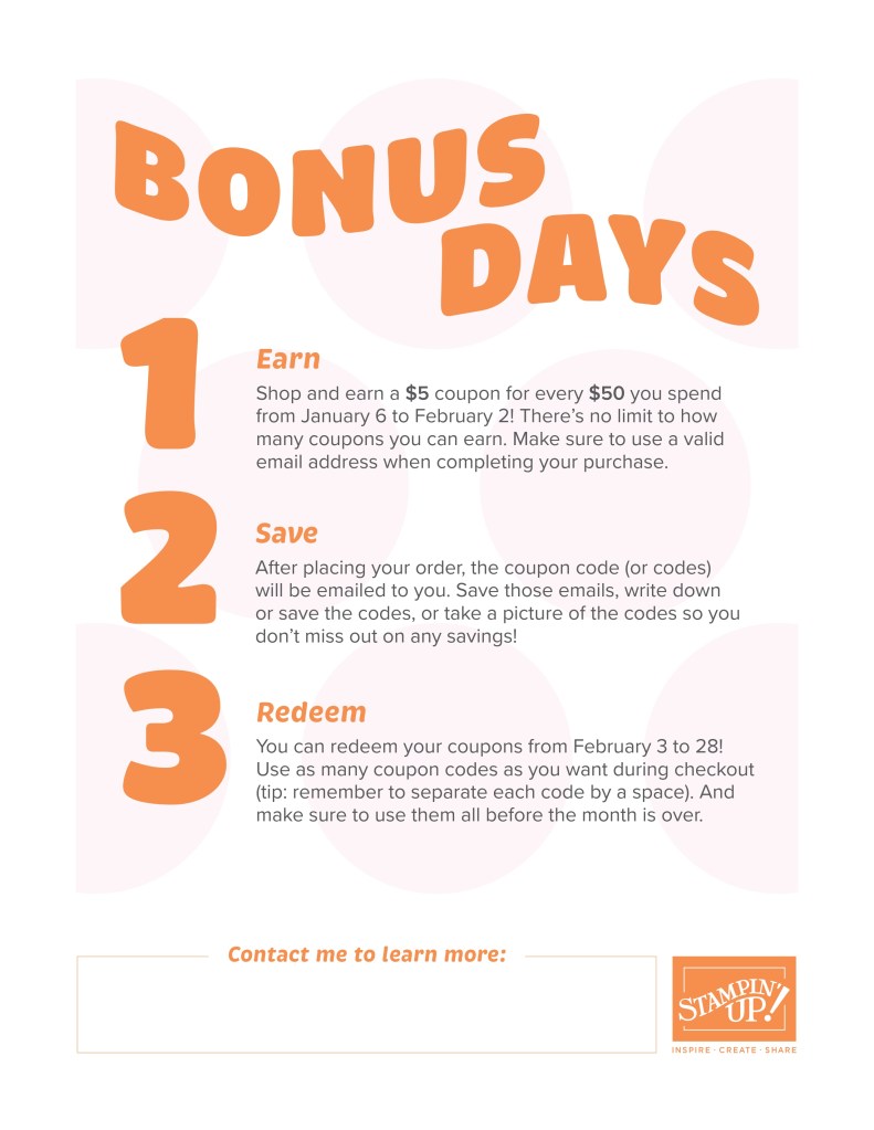 Itโs time for one of our favorite promotionsโBONUS DAYS! Because do you know whatโs a great deal? Getting rewarded for all the crafting supplies youโre already going to buy! When you shop between January 6 and February 2 and spend $50 USD | $60 CAD, you will earn a $5 USD | $6 CAD coupon! Make sure you save all your coupons because you can redeem them (and we mean ALL of them) between February 3 and 28. And donโt forgetโeach purchase earns you Stampinโ Rewards, so thatโs even more bang for your buck!