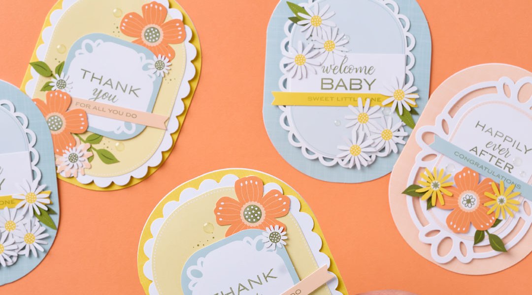 Have cards ready for life’s happiest events. With the Happy Happenings Kit, you can quickly craft cards to welcome a new baby, celebrate a wedding, or say thank you. These oval cards feature layered designs and pearlized details. Create them as shown or customize each one for the occasion.