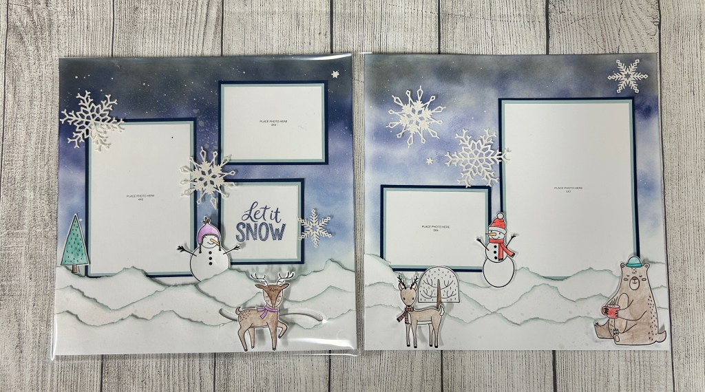 I OFFERED THIS CUTE WINTER LAYOUT TO MY LOCAL CUSTOMERS TO COME AND MAKE ON JANUARY 16. WE USED DISTRESS OXIDE INKS ON 2 WHITE CARDSTOCK SHEETS TO CREATE THE BACKGROUND. PAPER TEARING WAS USED TO CREATE THE SNOW. WE DISTRESSED THE EDGES TO GIVE IT A LITTLE MORE DEFINITION. THE DEER ON THE LEFT PAGE IS A SLIDER ELEMENT.