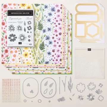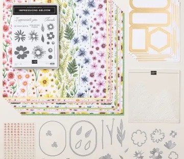 There are two new suite collections, Floral Impressions and Celebratory Sips. Products can be ordered individually or as a suite collection. There are also 8 additional stamp bundles as well as 3 new stamps, foil specialty paper, loose shaker elements, small circle shaker domes and new in color markers.