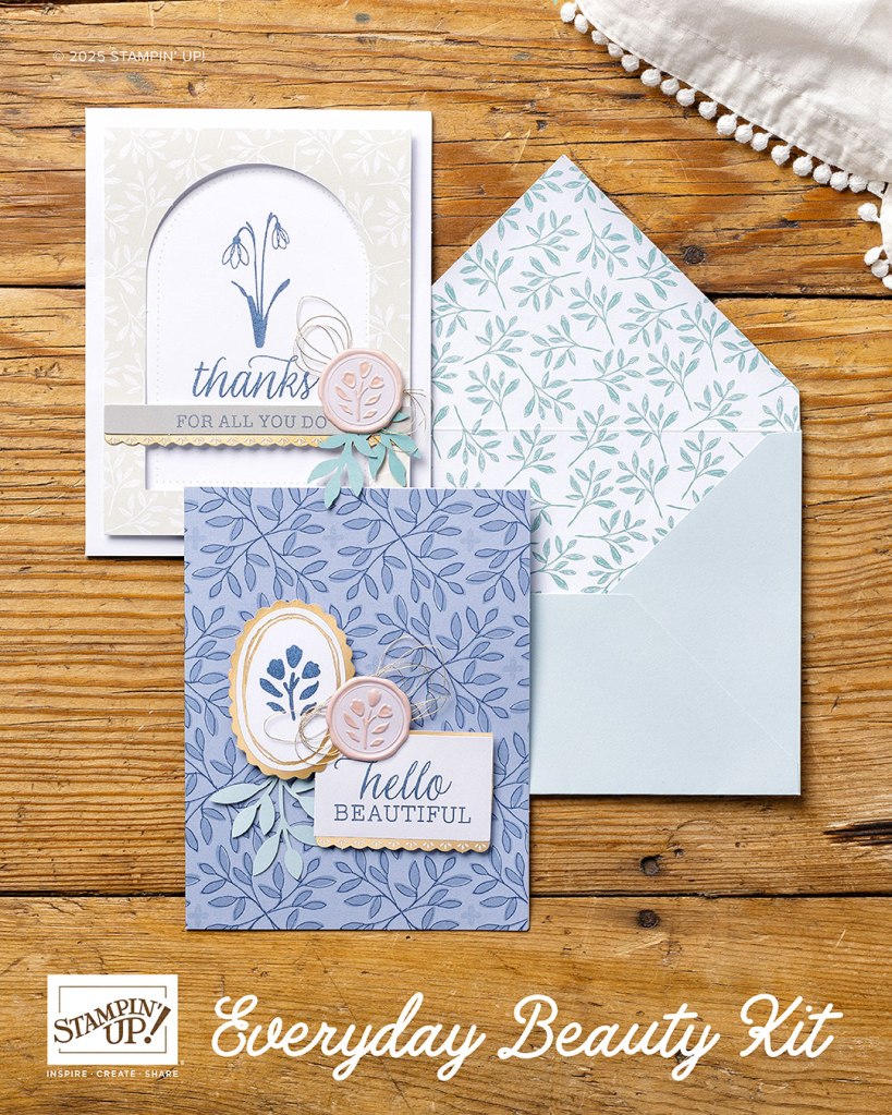 Create the perfect card for any occasion using the all-inclusive Everyday Beauty Kit. This kit comes with everything you need to make three unique card designs: printed card bases and coordinating envelopes with lovely botanical patterns, precut paper pieces, timeless faux wax seals, shimmering metallic thread, and a versatile stamp set that you can use on countless other projects.