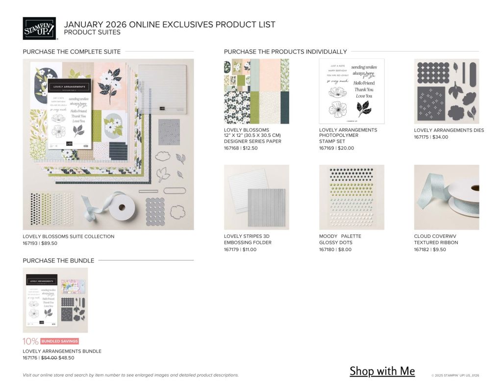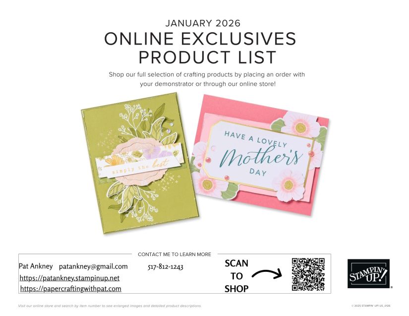 featured, Online Exclusives, scrapbookingJanuary 2026 Online Exclusives January 15, 2026 patankney Download your online exclusives brochure here Here are a few of my favorites: Shop the online exclusives here Happy Crafting, Pat Share this: Email a link to a friend (Opens in new window) Email TweetLike Loading... Related Published by patankney I am currently a Stampin' Up! Demonstrator. I am also Retired Dental Hygienist who loves to craft. I was an Independant Close To My Heart Maker until they closed in May 2024 and love to create scrapbook layouts and cards. View all posts by patankney