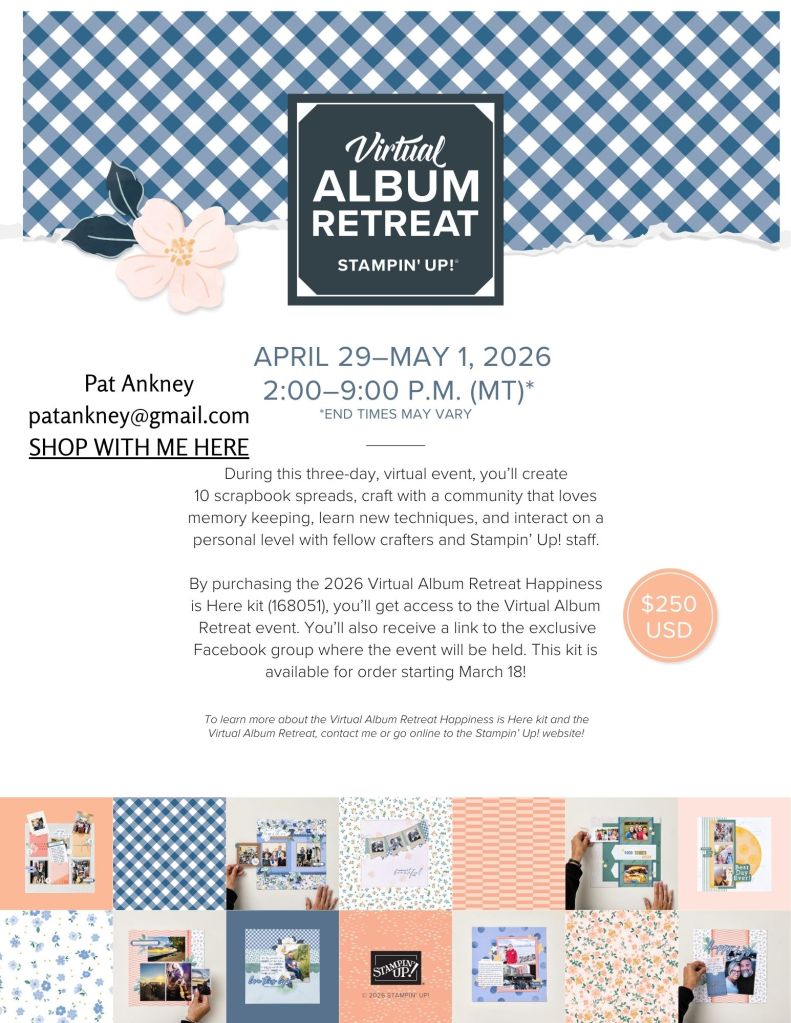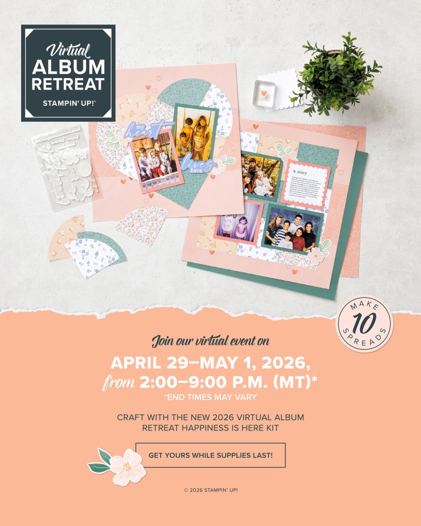 Join us this April for our Virtual Album Retreat, a three-day, virtual event where you’ll craft along with Stampin’ Up! staff as they go through the step-by-step process of creating a 10-spread scrapbook album using the 2026 Virtual Album Retreat Happiness is Here kit. This event is a great opportunity to find new customers and connect with friends who love to scrapbook!
