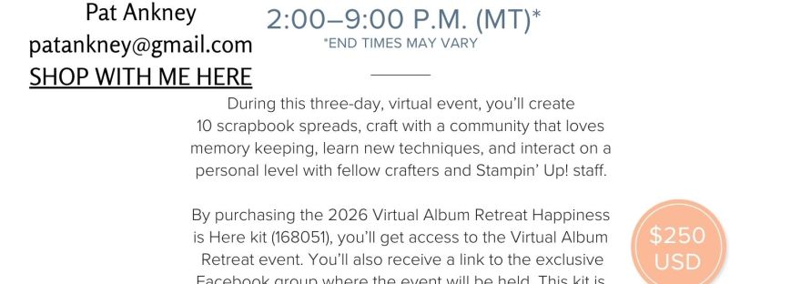 Join us this April for our Virtual Album Retreat, a three-day, virtual event where you’ll craft along with Stampin’ Up! staff as they go through the step-by-step process of creating a 10-spread scrapbook album using the 2026 Virtual Album Retreat Happiness is Here kit. This event is a great opportunity to find new customers and connect with friends who love to scrapbook!