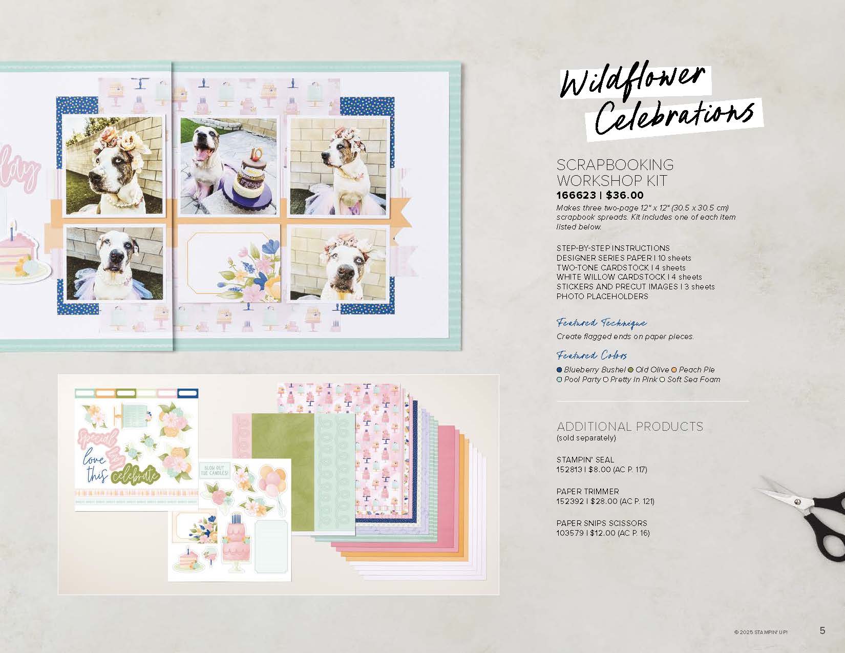 Our new Scrapbooking Brochure includes 4 new scrapbooking workshop kits with coordinating products, Wildflower Celebrations, Storybook Life, Meant to Bee and Everyday You & Me. Here’s a peek at the scrapbooking kits.